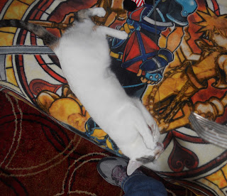 So in closing, just a few more things about Lucia that I've learned from my time with her. She really is an excellent cat - I've never had any housetraining or behavioral issues with her and though she does meow and make cat noises (I've never met a cat that doesn't) she is pretty quiet most of the time and I've never had any complaints from my neighbors. She's even generally fine with being left alone for large chunks of the day, and as long as I play with her for a good 10 minutes before bed she doesn't run around or keep me awake at night. She loves to cuddle, and will usually spend at least part if not all of the night curled up next to my head or at my feet. Her food preference is anything edible - she even eats vegetables, so don't offer her your broccoli thinking that she'll sniff it and lose interest. When she wants your attention she will reach out and bat at your face gently, or perhaps she will lick your cheek or the end of your nose. And when she feels incredibly comfortable with you she will rest her head on your arm, or leg, or whatever part of your body is closest.